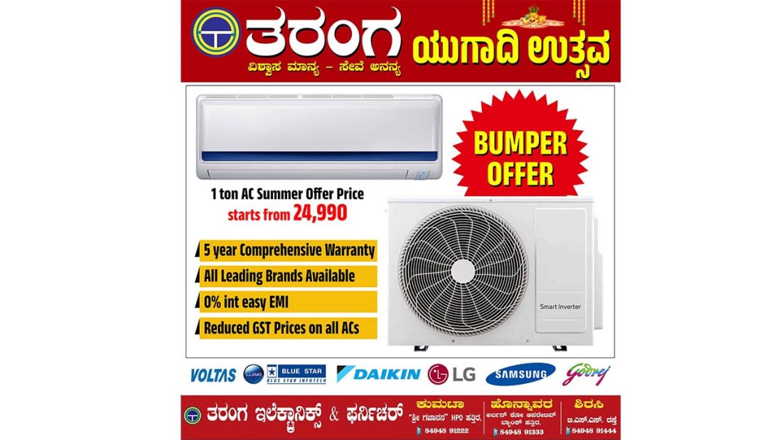 ಕುಮಟಾ: ಉತ್ತರಕನ್ನಡ ಜಿಲ್ಲೆಯ ಅತ್ಯಂತ ವಿಶ್ವಾಸಾರ್ಹ ಮತ್ತು ಅತಿದೊಡ್ಡ ಶೋರೂಮ್ ತರಂಗ ಎಲೆಕ್ಟ್ರಾನಿಕ್ಸ್ ನಲ್ಲಿ ಯುಗಾದಿ ಉತ್ಸವ ಹಿನ್ನಲೆ ಗೃಹೋಪಯೋಗಿ ವಸ್ತುಗಳ ಮೇಲೆ ಆಕರ್ಷಕ ರಿಯಾಯತಿ ನೀಡಲಾಗಿದೆ. ಆಫರ್ ಹಿನ್ನಲೆಯಲ್ಲಿ ಏ.ಸಿ ಮೇಲೆ ಬಂಪರ್ ಆಫರ್ ಇದ್ದು, ಒಂದು ಟನ್ ಎ.ಸಿ...