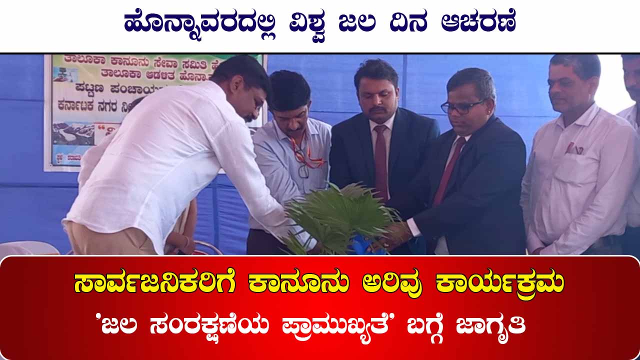 ಹೊನ್ನಾವರ: ವಿಶ್ವ ಜಲ ದಿನ” ಕಾನೂನು ಅರಿವು ಕಾರ್ಯಕ್ರಮ ನಡೆಯಿತು. ಗಿಡಕ್ಕೆ ನೀರೆರಯುವ ಮೂಲಕ ಕಾರ್ಯಕ್ರಮಕ್ಕೆ ಚಾಲನೆ ನೀಡಿದ, ಜೆ.ಎಂ.ಎಫ್.ಸಿ ನ್ಯಾಯಾಲಯದ ಹಿರಿಯ ಸಿವಿಲ್ ನ್ಯಾಯಾಧೀಶರು ಹಾಗೂ ತಾಲೂಕು ಕಾನೂನು ಸೇವಾ ಸಮಿತಿ ಹೊನ್ನಾವರ ಅಧ್ಯಕ್ಷರಾದ ಬಿ.ಸಿ. ಚಂದ್ರಶೇಖರ ಮಾತನಾಡಿ, ಇಂದು ಮನುಷ್ಯನ ಅತಿಯಾದ ಸ್ವಾರ್ಥದಿಂದ ನದಿ ಮಲೀನವಾಗುತ್ತಿದೆ. ಸ್ವಚ್ಚ ನೀರು ಸಿಗುತ್ತಿಲ್ಲ. ಮಲೆನಾಡು ಭಾಗವು ಬಯಲುಸೀಮೆಯ ತರಹವೇ ನೀರಿಗಾಗಿ ಹಾಹಾಕಾರ ಆಗುತ್ತಿದೆ. ನೀರಿನ ಸಂರಕ್ಷಣೆ ಸರ್ಕಾರದ ಕೆಲಸ ಮಾತ್ರವಲ್ಲ, ಸಂಘ-ಸoಸ್ಥೆಗಳು, ನಾಗರೀಕರು ಕೈಜೋಡಿಸಬೇಕು ಎಂದರು.