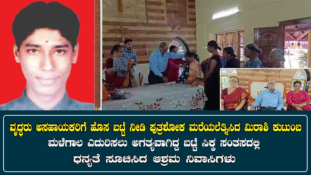 ಆದರೆ ನಾನು ಮತ್ತು ನನ್ನ ಹೆಂಡತಿ – ಮಕ್ಕಳು ಹಾಗೂ ಮೊಮ್ಮಕ್ಕಳು ಕೂಡಿ ಮುಂದೆಯೂ ನಿಮ್ಮೆಲ್ಲರಿಗೂ ನಮ್ಮ ಕೈಲಾದ ಸೇವೆ ಸಹಕಾರ ನೀಡುವುದಾಗಿ ಹೇಳುತ್ತಾ ಕ್ಷಣಕಾಲ ಭಾವುಕರಾದರು. ಮಳೆಗಾಲದ ಈ ದಿನಗಳಲ್ಲಿ ತಮಗೆ ಅಗತ್ಯವಾಗಿದ್ದ ಹೊಸ ಬಟ್ಟೆ ನೀಡಿದ್ದಕ್ಕೆ ಸಂತಸಗೊoಡ ಅಶ್ರಮದ ಕೆಲ ನಿವಾಸಿಗಳು, ಮಿರಾಶಿ ಕುಟುಂಬಕ್ಕೆ ಧನ್ಯತೆ ಸಮರ್ಪಿಸಿದರೆ ಅವರ ಸಂತಸ ಕಂಡ ಮಿರಾಶಿ ಕುಟುಂಬದವರು ಮಗನ ಅಗಲುವಿಕೆ ದುಃಖ ಮರೆಯಲೆತ್ನಿಸಿ ತಮ್ಮ ಸೇವೆ ಸಾರ್ಥಕವಾಗುತ್ತಿದೆ ಎಂದು ಸಮಾಧಾನ ಪಟ್ಟರಲ್ಲದೇ ಮಗನ ಪುಣ್ಯ ಸ್ಮರಣೆ ನಿಮಿತ್ತ ಜೂನ್ 16 ರಂದು ಆಶ್ರಮವಾಸಿಗಳಿಗೆ ಭೋಜನ ವ್ಯವಸ್ಥೆ ಮಾಡುವುದಾಗಿ ತಿಳಿಸಿದರು.