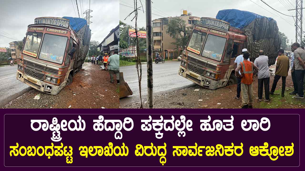 ಕುಮಟಾ: ಪಟ್ಟಣದ ಸನ್ಮಾನ ಹೋಟೆಲ್ ಎದುರು ಲಾರಿಯೊಂದು ರಸ್ತೆ ಬದಿಯಲ್ಲಿ ಹೂತಿದ್ದು, ಪಲ್ಟಿಯಾಗಿದ್ದೆ ಆದಲ್ಲಿ ದೊಡ್ಡ ಅನಾಹುತ ಸಂಭವಿಸುತ್ತಿತ್ತು ಎಂದು ಐಆರ್ಬಿ ಕಂಪನಿಯ ವಿರುದ್ದ ಸ್ಥಳೀಯರು ಅಸಮಧಾನ ಹೊರಹಾಕಿದ್ದಾರೆ. ಪ್ರತಿ ದಿನ ಸಾರ್ವಜನಿಕರು ಹೆದ್ದಾರಿ ಬದಿಯಲ್ಲಿ ಓಡಾಡುತ್ತಿರುತ್ತಾರೆ. ಇದೇ ಭಾರೀ ವಾಹನ ಹುಗಿದು ಪಲ್ಟಿಯಾಗಿದ್ದರೆ ದೊಡ್ಡ ಅನಾಹುತ ಸಂಭವಿಸುತ್ತಿತ್ತು.