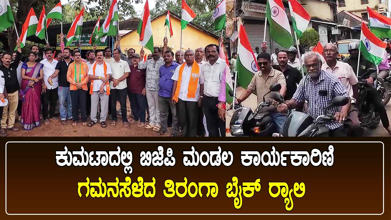 ಕಾರ್ಯಕಾರಿಣಿ ಸಭೆಯ ನಂತರ ಕುಮಟಾ ಪಟ್ಟಣದ ಹೆಗಡೆ ಕ್ರಾಸ್ ಸಮೀಪದಲ್ಲಿರುವ ನಾದಶ್ರೀ ಕಲಾ ಕೇಂದ್ರದಿAದ ಬಿಜೆಪಿ ಮೋರ್ಚಾ ನೇತೃತ್ವದಲ್ಲಿ ಆಪರೇಷನ್ ಸಿಂಧೂರ ಮತ್ತು ಆಪರೇಷನ್ ಮಹದೇವ್ ಯಶಸ್ವಿಗಾಗಿ ವೀರ ಯೋಧರಿಗೆ ನಮನ ಹಾಗೂ 79ನೇ ಸ್ವಾತಂತ್ರ್ಯ ದಿನದ ಅಂಗವಾಗಿ ತಿರಂಗಾ ಬೈಕ್ ರ್ಯಾಲಿ ಹಮ್ಮಿಕೊಳ್ಳಲಾಗಿತ್ತು. ಈ ಸಂದರ್ಭದಲ್ಲಿ ಸುಮಾರು 60 ಕ್ಕೂ ಅಧಿಕ ಬೈಕ್ ಗಳ ಮೂಲಕ ರ್ಯಾಲಿ ಪ್ರಾರಂಭವಾಗಿ ಕುಮಟಾ ಪಟ್ಟಣದ ಮಹಾಸತಿ ಸರ್ಕಲ್ ಮಾರ್ಗವಾಗಿ ಹಳೆ ಬಸ್ ನಿಲ್ದಾಣದ ಮೂಲಕ ಮೂರುಕಟ್ಟೆ, ರಥ ಬೀದಿ ಮರ್ಗವಾಗಿ ಗಿಬ್ ಸರ್ಕಲ್ ಮೂಲಕ ಪುನಃ ನಾದಶ್ರೀ ಕಲಾಕೇಂದ್ರಕ್ಕೆ ಬರುವುದರ ಮೂಲಕ ಜನಜಾಗೃತಿ ಮೂಡಿಸಲಾಯಿತು.