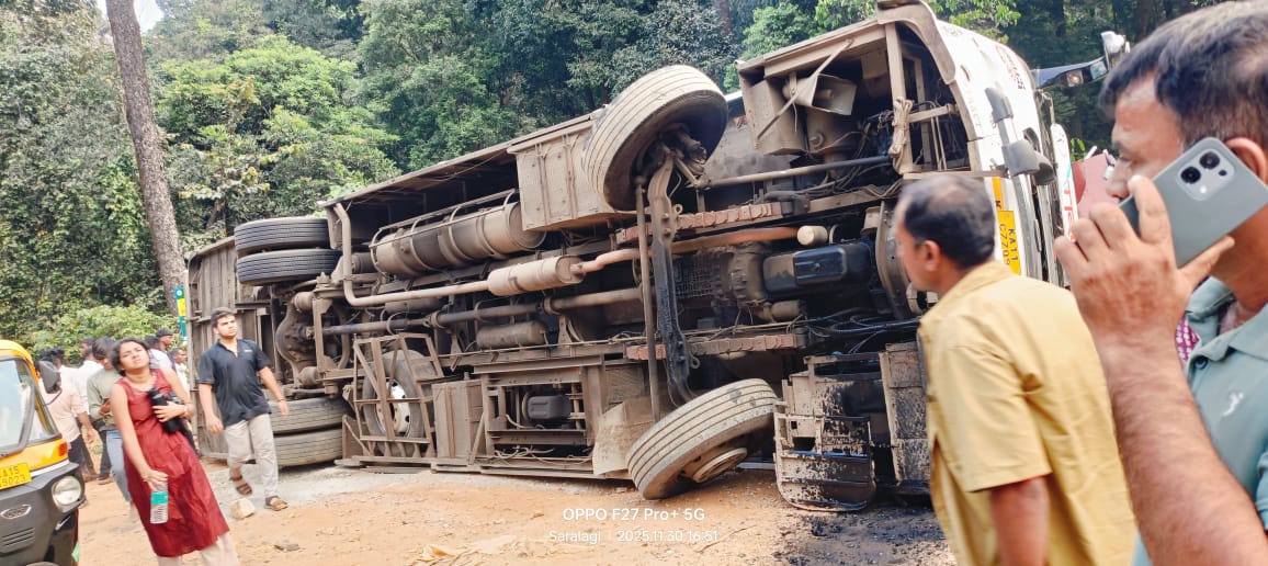 ಪಲ್ಟಿಯಾದ ಬಸ್: 45 ಕ್ಕೂ ಹೆಚ್ಚು ಪ್ರಯಾಣಿಕರಿಗೆ ಗಾಯ