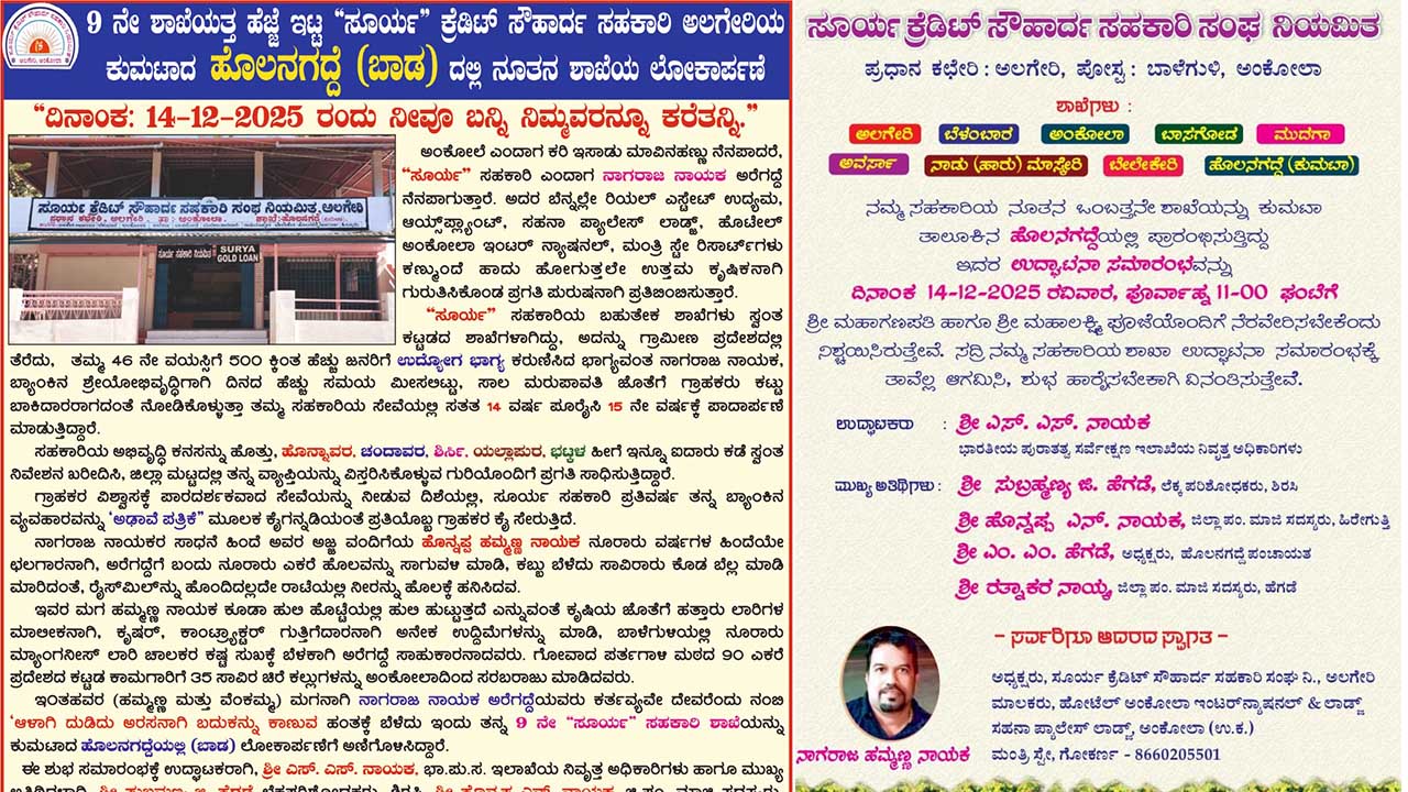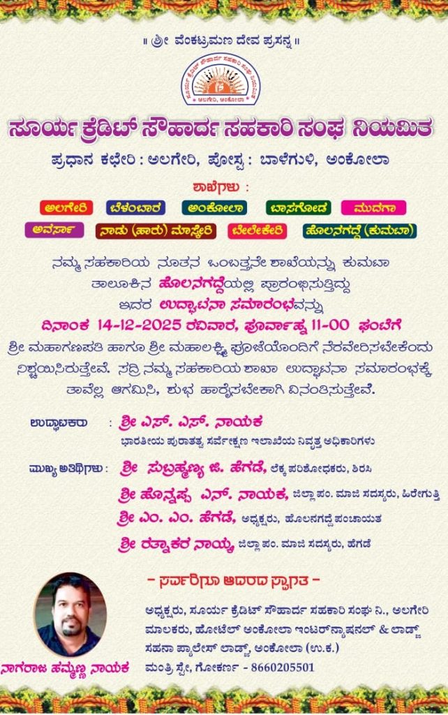 ವಿ.ಸೂ. ‘ಸೂರ್ಯ’ ಸಂಸ್ಥಾಪಕ ನಾಗರಾಜ ನಾಯಕರಿಗೆ ದಶಬಾಹುವಿನ ಸ್ಥಾನದಲ್ಲಿ ಕಂಗೊಳಿಸಲು ಅಂಕೋಲಾ ತಾಲೂಕಿನ ಹಿಲ್ಲೂರಿನಲ್ಲಿ ಹತ್ತನೇ ನೂತನ ಶಾಖೆ ದಿನಾಂಕ: 18-12-2025 ರಂದು ಮುಂಜಾನೆ 11-00 ಗಂಟೆಗೆ ಲೋಕಾರ್ಪಣೆಗೊಳ್ಳಲಿದೆ. ಈ ಶುಭ ಕಾರ್ಯದಲ್ಲಿ ತಾವು ಬಂದು ಶುಭ ಹಾರೈಸಲು ಆದರದ ಸ್ವಾಗತ ಕೋರುವವರು. ನಾಗರಾಜ ಹಮ್ಮಣ್ಣ ನಾಯಕ ಅರೆಗದ್ದೆ