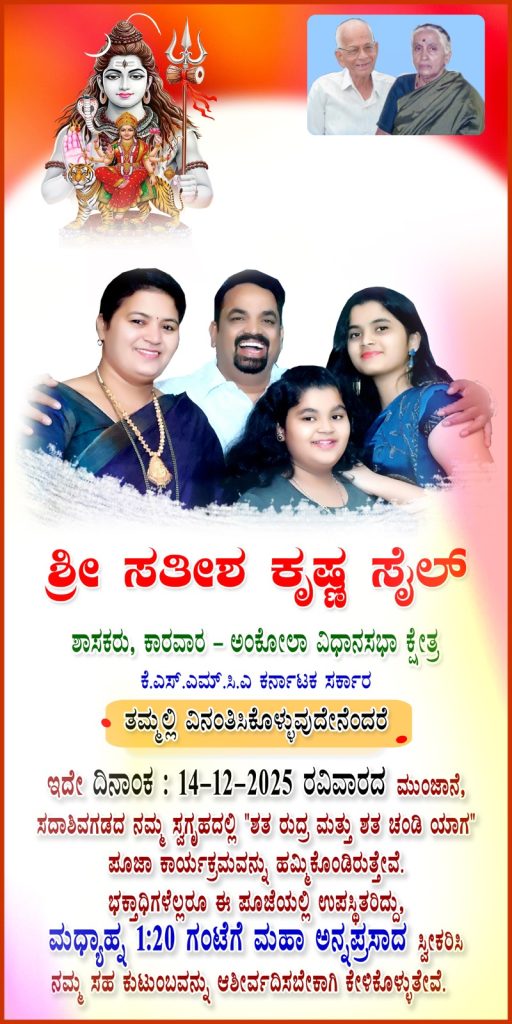 ಕಾರವಾರ: ದಿವಂಗತ ಕೃಷ್ಣ ಸೈಲ್ ಹಾಗೂ ಗಿರಿಜಾ ಕೃಷ್ಣ ಸೈಲ್ ರವರ ಆರ್ಶೀವಾದದೊಂದಿಗೆ ಈ ಕ್ಷೇತ್ರದ ಆತ್ಮೀಯನಾದ ನಾನು, ಸತೀಶ ಕೃಷ್ಣ ಸೈಲ್, ಶಾಸಕರು ಕಾರವಾರ ಅಂಕೋಲಾ ವಿಧಾನಸಭಾ ಕ್ಷೇತ್ರ ವಿನಂತಿಸಿಕೊಳ್ಳುವುದೇನೆಂದರೆ, ಪ್ರತಿವರ್ಷದಂತೆ ನಾಳೆ ದಿನಾಂಕ: 14.12.2025ರಂದು ಭಾನುವಾರ ಮಧ್ಯಾಹ್ನ 1-20 ಗಂಟೆಗೆ ಸದಾಶಿವಗಡದಲ್ಲಿರುವ ನಮ್ಮ ಸ್ವಗೃಹದಲ್ಲಿ “ಶತರುದ್ರ ಮತ್ತು ಶತಚಂಡಿಕಾ ಯಾಗ” ಧಾರ್ಮಿಕ ಕಾರ್ಯಕ್ರಮಗಳನ್ನು ನೆರವೇರಿಸುತ್ತಿದ್ದೇವೆ. ತಾವುಗಳು ಸಹ ಕುಟುಂಬದೊಂದಿಗೆ ಈ ಕಾರ್ಯಕ್ರಮದಲ್ಲಿ ಪಾಲ್ಗೊಂಡು ಶ್ರೀ ದೇವರುಗಳ ಆರ್ಶೀವಾದವನ್ನು ಪಡೆದು. ಪ್ರಸಾದವನ್ನು ಸ್ವೀಕರಿಸಿ ನಮ್ಮನ್ನು ಸಹ ಆರ್ಶೀವ್ರದಿಸಬೇಕೆಂದು ಕೇಳಿಕೊಳ್ಳುತ್ತೇನೆ. ನನ್ನ ಅನಾರೋಗ್ಯ ಕಾರಣದಿಂದ ಖುದ್ದಾಗಿ ನಿಮ್ಮನ್ನು ಸಂಪರ್ಕಿಸಿ ಈ ಕಾರ್ಯಕ್ರಮಕ್ಕೆ ಆಹ್ವಾನಿಸಲು ಸಾಧ್ಯವಾಗಲಿಲ್ಲ. ಅದಕ್ಕೆ ವಿಷಾದವನ್ನು ಸಹ ವ್ಯಕ್ತಪಡಿಸುತ್ತಿದ್ದೇನೆ.