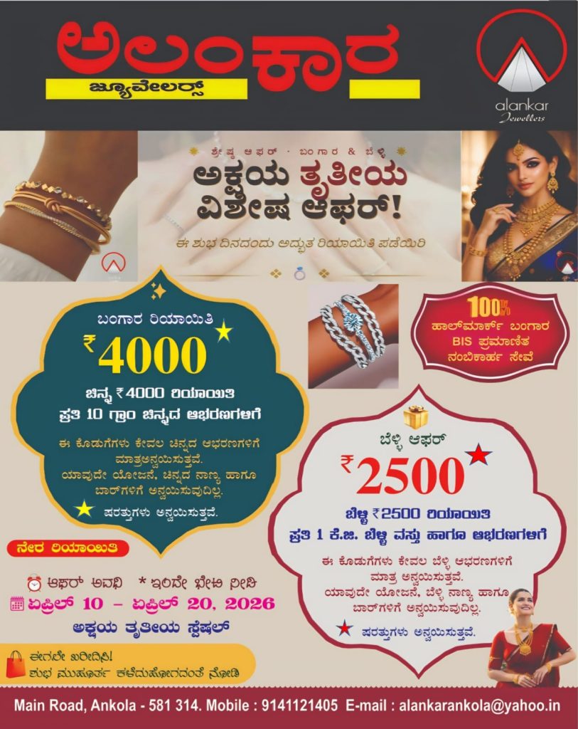 ಅಕ್ಷಯ ತೃತೀಯದ ಶುಭ ಸಂದರ್ಭದಲ್ಲಿ ಅಂಕೋಲಾದ ಪ್ರಸಿದ್ಧ Alankara Jewellers ಗ್ರಾಹಕರಿಗಾಗಿ ವಿಶೇಷ ಆಫರ್‌ಗಳನ್ನು ಪ್ರಕಟಿಸಿದೆ. “ಸುವರ್ಣ ಕ್ಷಣವನ್ನು ಇನ್ನಷ್ಟು ವಿಶೇಷವಾಗಿಸಿ” ಎಂಬ ಘೋಷವಾಕ್ಯದೊಂದಿಗೆ, ಚಿನ್ನ ಮತ್ತು ಬೆಳ್ಳಿ ಖರೀದಿಗೆ ಆಕರ್ಷಕ ರಿಯಾಯಿತಿಗಳನ್ನು ನೀಡಲಾಗುತ್ತಿದೆ.